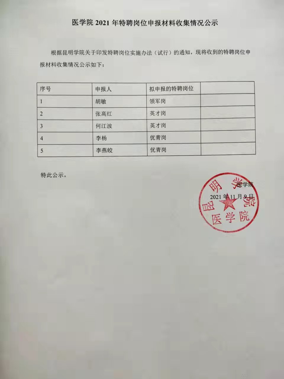 医学院2021年特聘岗位申报情况公示
