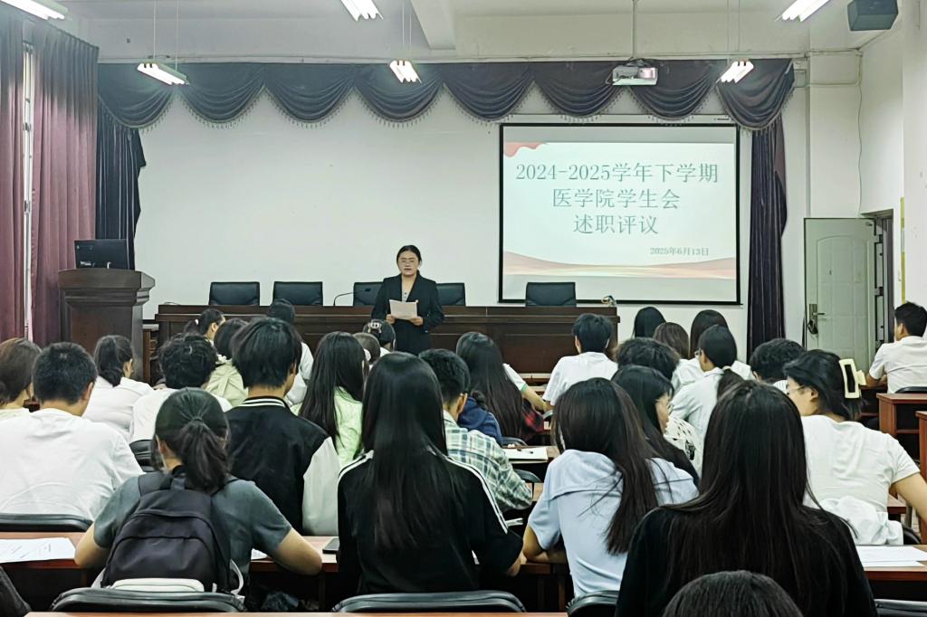 为总结工作经验、提升服务效能,昆明学院医学院学生会于2025年6月13日在医学楼-2103教室举行学生干部述职评议会。医学院团委书记胡梦蝶老师、学生会主席团成员、各部门负责人及学生代表参加会议。