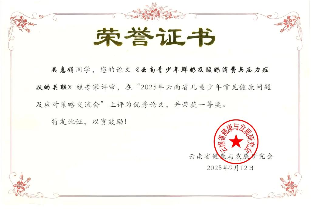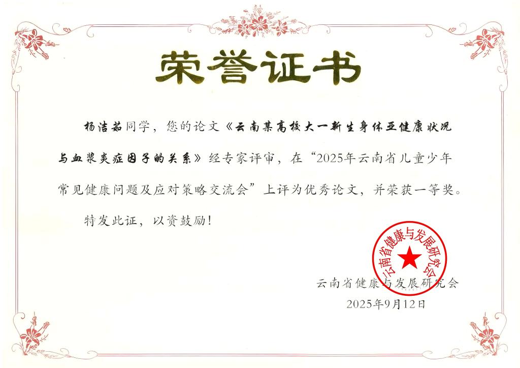 9月12日,在云南省预防医学会、云南省健康与发展研究会共同举办的“2025年云南省儿童少年常见健康问题及应对策略交流会”上,昆明学院医学院传来喜讯。医学院硕士研究生杨洁茹的论文《云南某高校大一新生身体亚健康状况与血浆炎症因子的关系》,以及本科生吴惠娟的论文《云南青少年鲜奶及酸奶消费与压力症状的关联》,在徐洪吕博士指导下,双双荣获优秀论文一等奖,全省仅三篇论文获此殊荣。