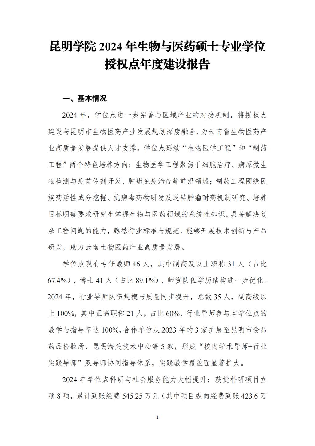 昆明学院2024年生物与医药硕士专业学位授权点年度建设报告