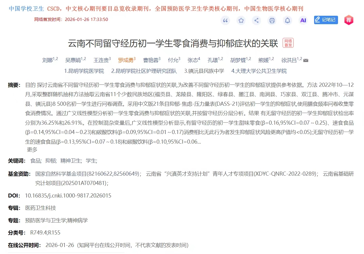 这些成果源于徐洪吕教授主持的国家自然科学基金项目,聚焦云南多民族青少年健康与不健康饮食消费和抑郁症状的关联,研究结果为云南青少年饮食行为干预和心理健康促进提供了理论与数据支撑。