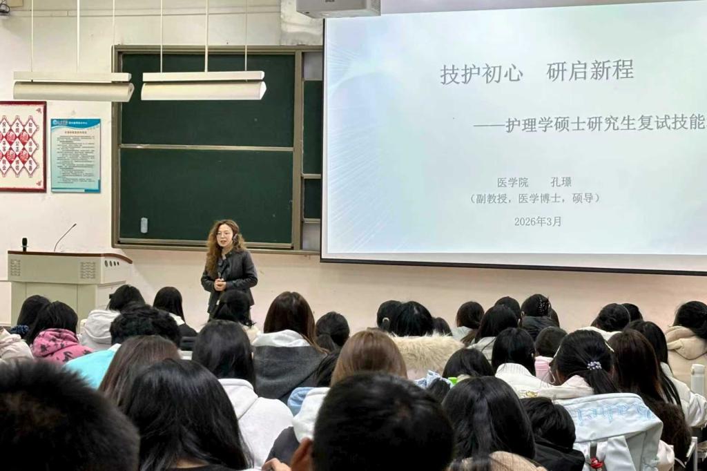 孔璟博士以《技护初心,研启新程》为题开展护理硕士研究生复试技能培训,围绕复试全流程、专业能力展示要点、面试沟通技巧等内容进行细致讲解,为即将参加复试的同学提供清晰实用的指引。徐洪吕教授以《一“研”为定》为题,结合团队近期完成的云南省大学生考研意愿调查结果,深入分析影响考研选择的核心因素,鼓励同学们不设限、不畏难,勇敢追求更高目标。