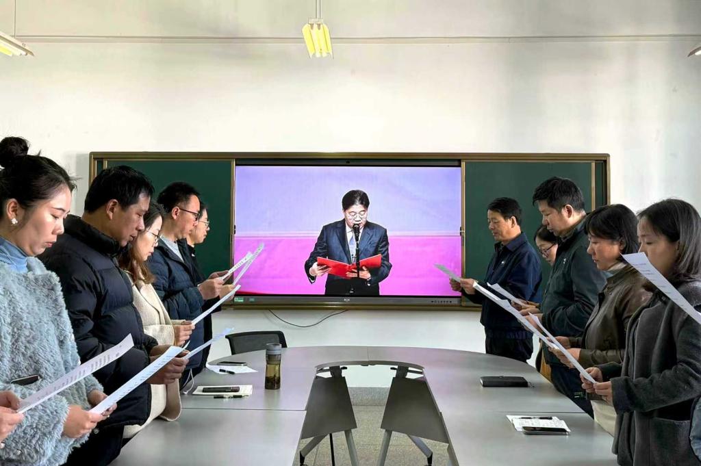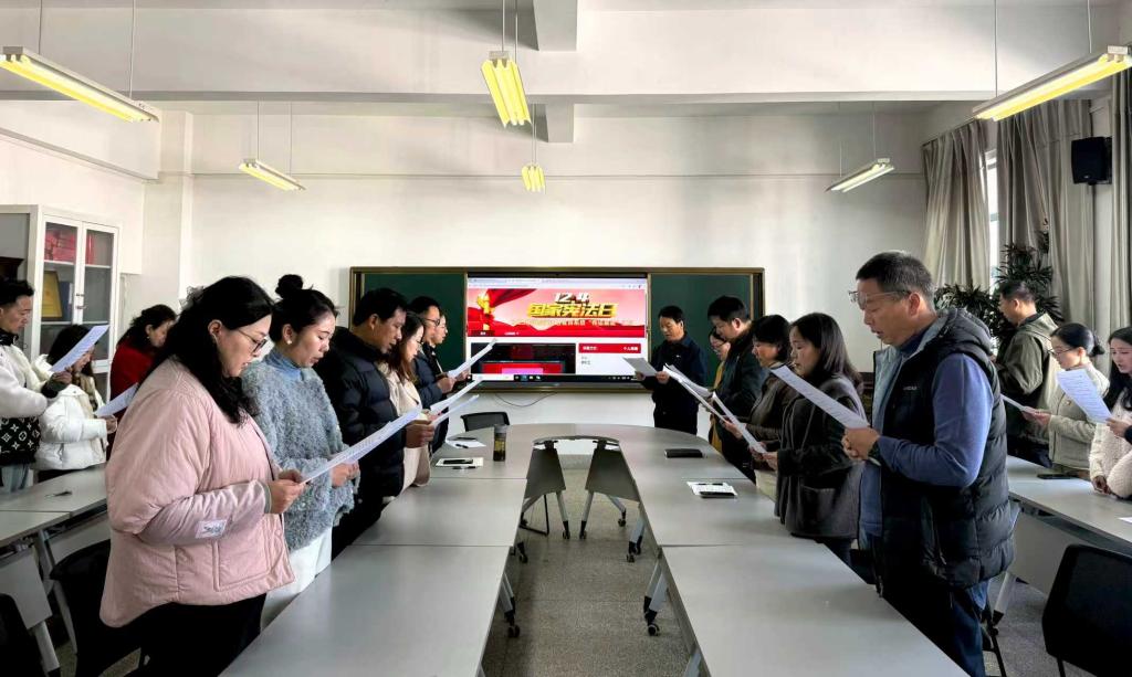 当天上午10点,学院领导班子成员和无课的教师代表齐聚医学楼1417会议室,通过教育部全国青少年普法网集中收看2025年国家宪法日教育系统“宪法晨读”活动网络直播。大家共同参与升旗仪式,随后手持宪法晨读材料,跟随教育部北京主会场同步诵读宪法部分条款。