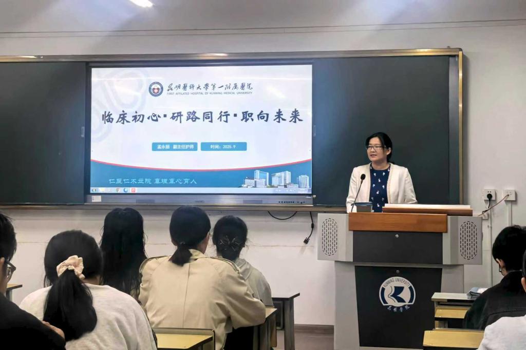 2025年9月29日,昆明学院医学院邀请昆明医科大学第一附属医院感染性疾病科副护士长孟永丽,在昆师路校区4307教室开展“临床初心・研路同行・职向未来”主题讲座,助力护理学专业学生明确考研方向与职业路径。