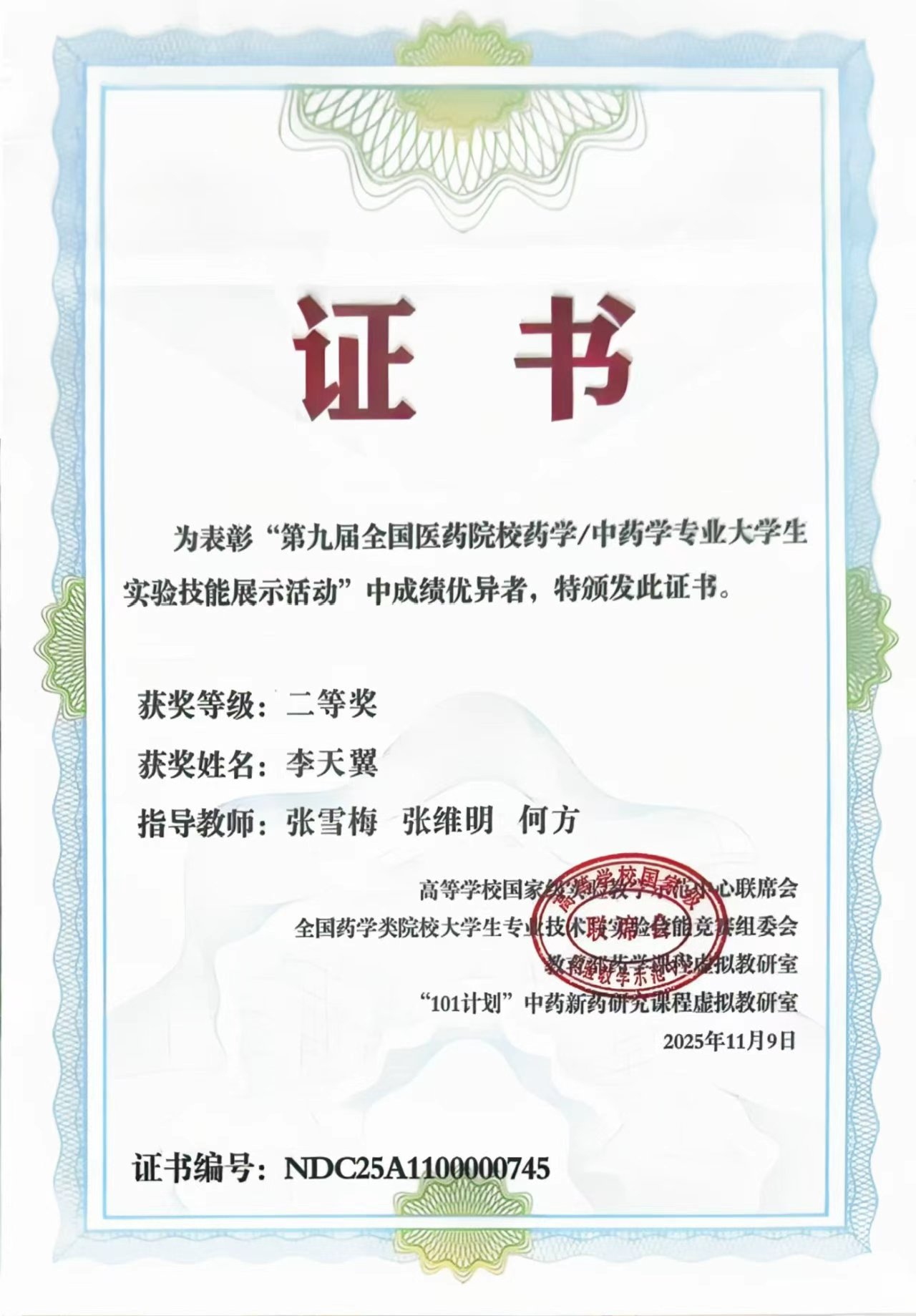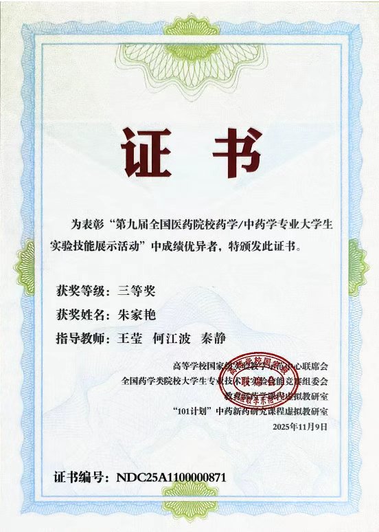 2025年11月7日至10日,第九届全国医药院校药学/中药学专业大学生实验技能展示活动暨实验、实践教学研讨会在南京圆满结束。昆明学院医学院学子李天翼、朱家艳在此次赛事中表现出色,分别荣获二等奖、三等奖。