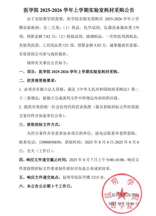 医学院2025-2026学年上学期实验室耗材采购公告