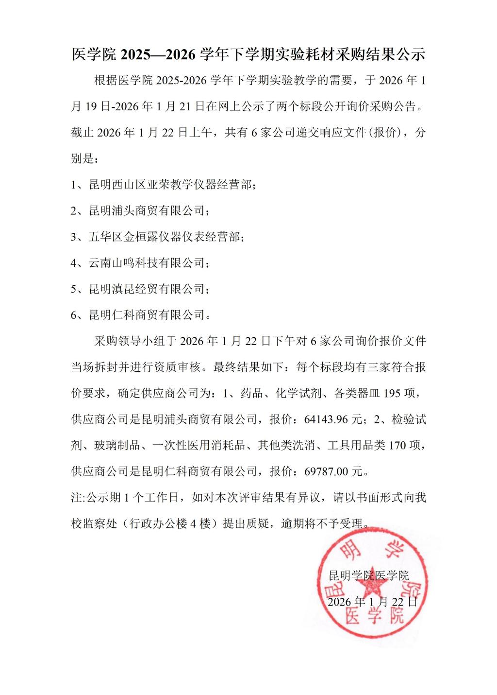 医学院2025—2026学年下学期实验耗材采购结果公示